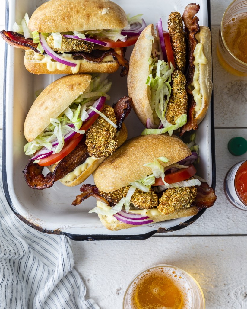 This classic New Orleans sandwich is thought to be a version of the sub or hoagy of the Northeast using local ingredients. The origin story goes back to 1929, when a restaurant in the city served free sandwiches to streetcar drivers who were on strike and so were called “poor boys,” or “po’boys” in the local dialect. This version of the recipe is known as a “dressed” po’boy because it includes bacon, lettuce, and tomatoes. Use only your best ripe summer tomatoes here.