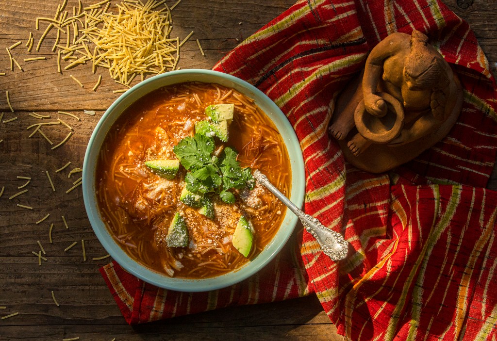This is a riff on the Mexican soup Sopa de Fideo. Fideo means noodle, usually used in the plural fideos to mean vermicelli. Fideo noodles, a type of thin, cut pasta, are traditionally used. Vermicelli or angel hair often substituted. Special Fideo noodles are sold at most Latin/Mexican grocery stores.